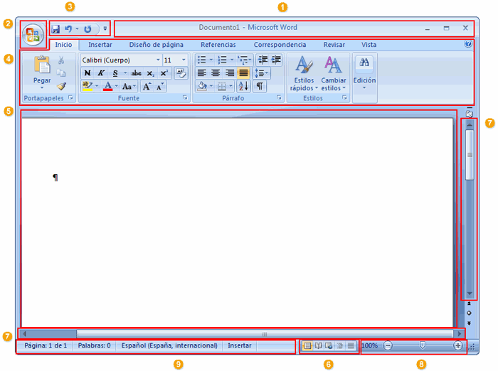 9. Barra de estado: muestra información sobre el documento que está editando.